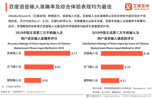(艾媒咨询《2019中国第三方手机输入法市场年度专题研究报告》) AI技术的加持和行业、用户认可,为百度输入法语音输入突破10亿次日均请求量埋下伏笔。据艾媒咨询发布的《2019中国第三方手机输入法市场年度专题研究报告》显示,百度输入法语音输入准确率、用户满意度均位列行业第一,百度输入法的用户日均输入频率也远超业内平均水平。百度输入法在AI技术应用落地、AI功能数量、AI技术应用综合满意度等方面优势明显。