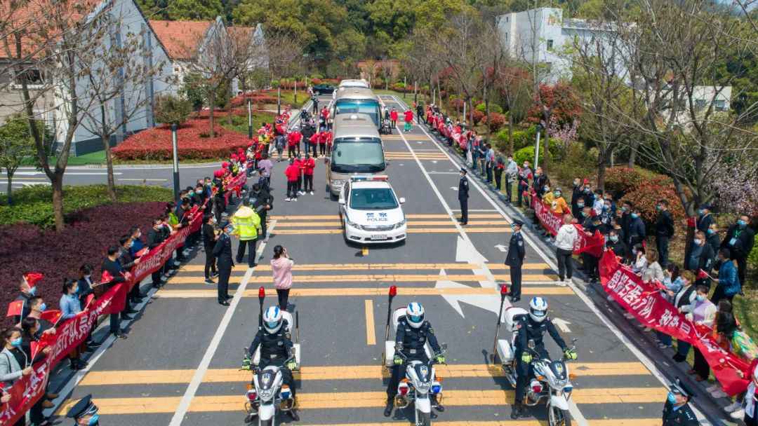 江陵市民自发前往医疗队车队颠末的街道,欢送这些恩人回家。