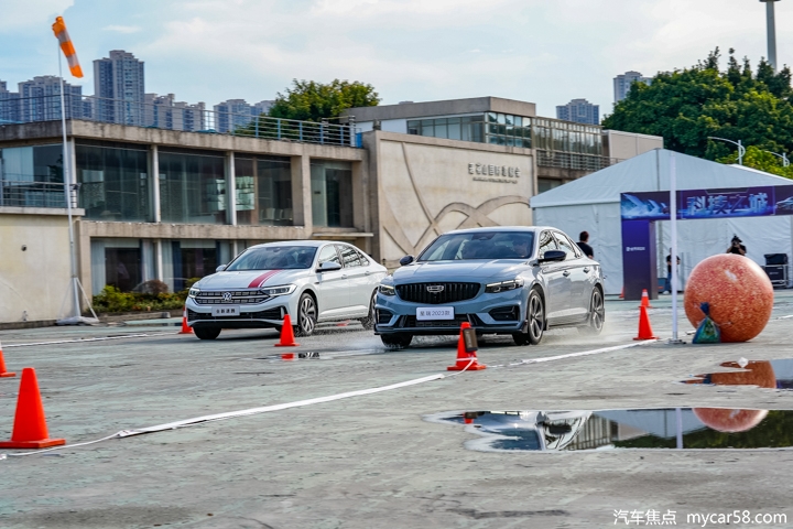 随后的蛇皮走位环节中,虽然吉利星瑞在车身尺寸数据上要明显领先于大众速腾,但1618mm的轮间距依旧赋予其十足的灵活度,即使赛道规划得较为紧凑但跑起来依然给到驾驶员得心应手的感觉。并且在这种连续绕弯的路况中,星瑞整车姿态保持得相当不错,足够可控的侧倾能给到驾驶员足够的信心,以往我们都说大众底盘高级,但其实我们国产品牌在底盘调校功底上已经不输这些德系品牌。 来到科技之城,主要体验的是吉利星瑞和大众速腾在智能安全配置方面的差异,痛苦面具环节两车将以20km/h、30km/h的时速同时前进,前方设置“假人”模拟行人经过,两车启用自动刹车,分别测量车辆到假人的距离来计算最终成绩。吉利星瑞在两个模拟时速下的自动成绩都要优于速腾,并且系统对于模拟行人的识别响应速度相当快,日常通勤中能够大大提升用户的出行安全。