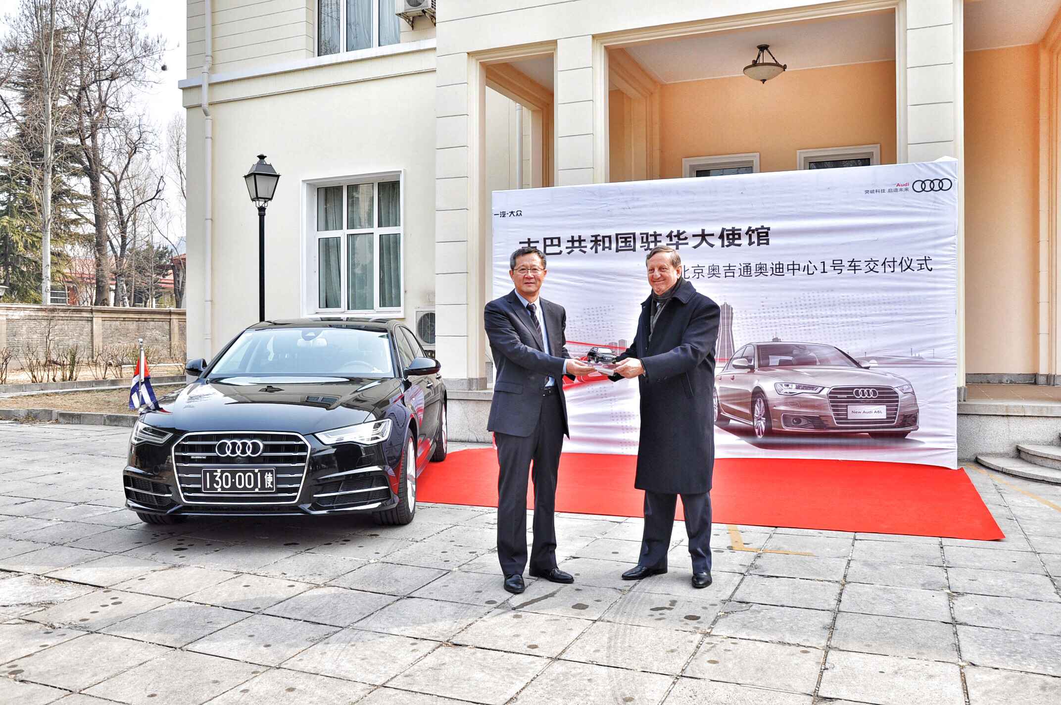 3月12日,在古巴共和国驻华大使馆,一汽-公共奥迪销售事业部北部区总司理王宝春先生与北京奥吉通奥迪中心总司理周发熠先生配合将一辆全新一代奥迪A6L轿车交付给古巴共和国驻华大使米格尔ㆍ拉米雷斯先生及夫人手中,该车将作为古巴共和国驻华大使一号用车正式投入利用。