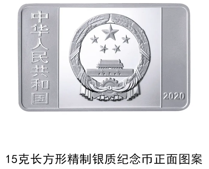 15克长方形银质眷念币不和图案为太和殿修建造型,辅以祥云及台基等组合设计。