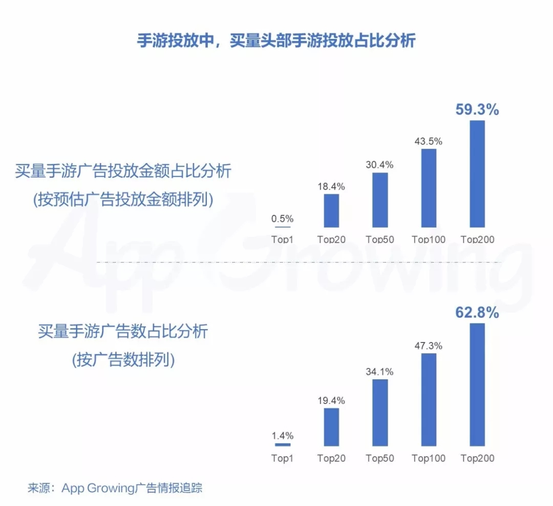 PS.此处将同款游戏的的ios及不同安卓apk包合并统计为单一的手游品牌,报告所涉及的广告仅指落地页导向某款App应用下载的广告,广告投放金额为App Growing基于所追踪到的广告数据及大盘投放趋势,基于算法预估模型预估而得,以下同。 2)预估广告投放金额Top200手游占比接近6成 在整体手游广告投放中,预估广告投放金额Top20的投放金额占整体手游广告投放的18.4%,而Top200的广告投放金额则占比59.3%;广告投放数Top20的广告数占整体手游广告投放数的19.4%,而Top200的广告数则占比62.8%;