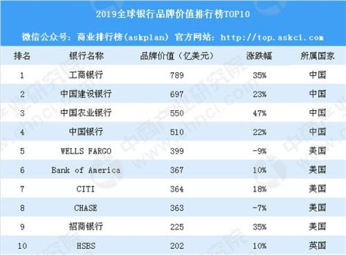 摘要:Brand Finance最近的一份报告评选出了世界银行业最具价值品牌。排名前十的银行分别为:工行、建行、农行、中行、WELLS FARGO、Bank of America、CITI、CHASE、 招商银行 、HSBS。 在最具品牌价值前十名中,中资银行不仅占据半数,更是包揽了榜单前四位:工行... Brand Finance最近的一份报告评选出了世界银行业最具价值品牌。排名前十的银行分别为:工行、建行、农行、中行、WELLS FARGO、Bank of America、CITI、CHASE、招商银行、HSBS。 在最具品牌价值前十名中,中资银行不仅占据半数,更是包揽了榜单前四位:工行、建行、农行、中行。其中,工行是全球最具价值的银行品牌,增长35%,达到798亿美元,连续第三年蝉联榜首。建行以697亿美元排名第二,农行和中行分别以550亿美元和510亿美元排名第三和第四。招商银行以225亿美元首度进入该排行榜前十名。