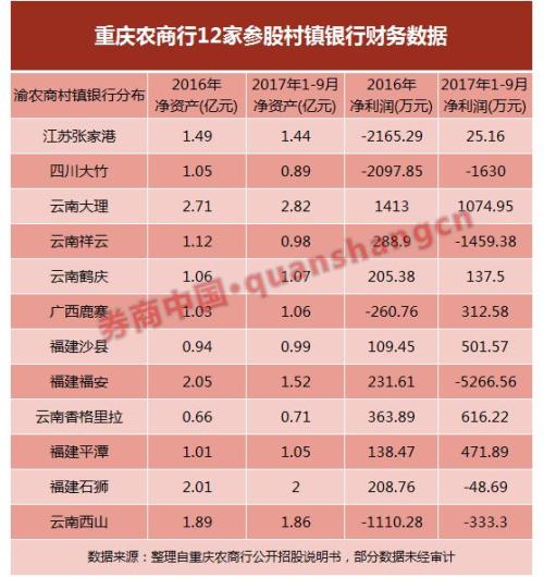 重庆农商行控股12家村镇银行 截至2017年末,重庆农商行持股51%以上的村镇银行已达12家,资产总额36.28亿元,存款余额16.44亿元,贷款余额22.48亿元。 村镇银行盈利不佳 据监管部门统计,截至2017年末,我国共有村镇银行1562家。按监管规定,我国村镇银行施行发起方式设立,且至少应有以及以上境内外银行业金融机构作为主发起人,再加上农商行和村镇银行同属于农信系统,因此不少村镇银行大股东都为农商行,而部门农商行对村镇银行情有独钟,参控股多家村镇银行。 除了上述的上海农商行、重庆农商行,还有常熟银行(行情601128,诊股)持有30家村镇银行股权,广州农商行参股25家村镇银行,网点地址多遍布在该农商行所处省份之外。